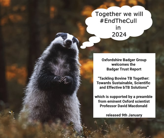 Our Group is very concerned that DEFRA are considering continuing and intensifying the cull rather than phasing it out. They are looking at introducing ‘epi-Culling zones' where farmers would be licenced to kill ALL (100%) of badgers across a wide area around new herd breakdowns. Although Boving TB rates have been falling in Oxfordshire, there are areas (centred around Deddington/Somerton, Thame/Chinnor and Henley on Thames) that might become epi-culling pilot zones.