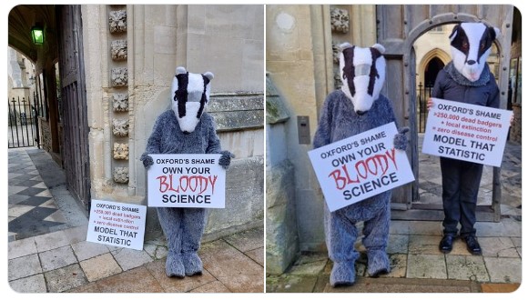 Prior to the meeting, SAD badgers stood outside Merton in silent protest against Oxford's part in facilitating the slaughter. They call on Rosie and her fellow Oxford Scientists to 'OWN THEIR BLOODY SCIENCE" and take responsibility for the deaths of nearly a quarter million badgers.